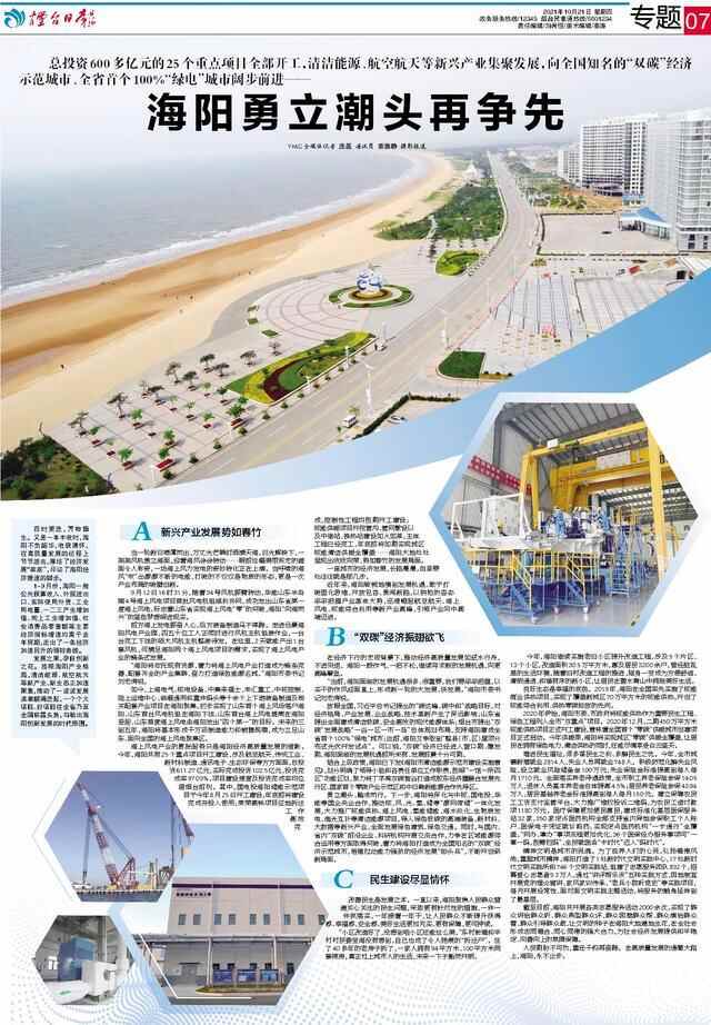 大小新闻客户端10月21日讯(YMG全媒体记者 庞磊 通讯员 姜雅静 摄影报道)四时更迭,万物循生。又是一年丰收时,海阳不负韶华,收获满怀,在高质量发展的征程上节节进击,厚培了经济发展“家底”,印证了海阳经济提速的脚步。 1-9月份,海阳一般公共预算收入、外贸进出口、实际使用外资、工业用电量、一二三产业增加值、规上工业增加值、社会消费品零售额等主要经济指标增速均高于去年同期,走出了一条经济加速回升的强韧曲线。 发展之果,孕自创新之花。放眼海阳产业格局,清洁能源、航空航天等新产业、新业态正加速聚集,推动了一波波发展浪潮翻涌迭起,一个个大项目、好项目在全省乃至全国崭露头角,勾勒出海阳创新发展的时代版图。 新兴产业发展势如春竹 当一轮新日喷薄而出,万丈光芒瞬时洒满天海,日光辉映下,一架架风机傲立海面,迎着海风徐徐转动……眼前这幅美丽恢宏的画面令人称奇,一场海上风力发电的奇妙转化正在上演。当呼啸的海风“吹”出源源不断的电能,打破的不仅仅是物质的形态,更是一次产业布局的破壁创新。 9月12日16时31分,随着34号风机振臂转动,华能山东半岛南4号海上风电项目首批风电机组顺利并网,成功发出山东省第一度海上风电,标志着山东省实现海上风电“零”的突破,海阳“向海而兴”的蓝色梦想照进现实。 前方海上发电振奋人心,后方装备制造马不停蹄。走进远景海阳风电产业园,四五十位工人正同时进行风机主机组装作业,一台台完工下线的硕大风机主机整装待发。在这里,2天就能产出1台套风机,可满足海阳两个海上风电项目的需求,实现了海上风电产业的链条式发展。 “海阳将依托现有资源,着力将海上风电产业打造成为链条完善、配套齐全的产业集群,奋力打造绿色能源名城。”海阳市委书记刘宏涛说。 如今,上海电气、核电设备、中集来福士、丰汇重工、中核控制、陆上运维中心、临港通用和重件码头等十余个上下游装备制造及相关配套产业项目在海阳聚集,初步实现了山东首个海上风场落户海阳、山东首台风电机组在海阳下线、山东首台海上风电塔筒在海阳竖起、山东首度海上风电由海阳发出“四个第一”的目标。未来的三到五年,海阳将基本形成千万级制造能力和销售规模,成为立足山东、面向全国的海上风电聚集区。 海上风电产业的膨胀起势只是海阳经济高质量发展的缩影。今年,海阳共有25个重点项目开工建设,涉及航空航天、传统工业、新材料制造、通讯电子、生态环保等方方面面,总投资611.27亿元,实际完成投资102.5亿元,投资完成率97.09%,项目建设速度及投资完成率均位居烟台前列。其中,国电投海阳储能示范项目于今年8月25日开工建设,年底前将建设完成并投入使用;莱荣高铁项目征地拆迁工作高效完成,控制性工程均按期开工建设;核能供暖项目开挖管沟、管网敷设以及中继站、换热站建设如火如荼,主体工程已经完工,年底前将如期实现城区核能清洁供暖全覆盖……海阳大地处处呈现出欣欣向荣、势如春竹的发展局面。 一座城市的经济发展,长路漫漫,但紧要处往往就是那几步。 近年来,海阳敏锐地嗅到发展机遇,敢于打破固化思维,开放包容、勇闯新路,以拼抢的姿态牢牢把握产业革命大势,迅速崛起航空航天、海上风电、核能综合利用等新产业高峰,引领产业向中高端迈进。 “双碳”经济振翅欲飞 在经济下行的宏观背景下,推动经济高质量发展如逆水行舟,不进则退。海阳一鼓作气、一把不松,继续寻求新的发展机遇,向更高峰攀登。 “当前,海阳面临的发展机遇很多、很重要,我们要牢牢把握,以实干的作风迎面直上,形成新一轮的大发展、快发展。”海阳市委书记刘宏涛说。 放眼全国,习近平总书记提出的“碳达峰、碳中和”战略目标,对经济格局、产业发展、企业战略、技术革新产生了深远影响;山东省提出全面建成清洁低碳、安全高效的现代能源体系;烟台市提出“双碳”发展战略“一谷一区一市一岛”总体规划布局,支持海阳建成全省首个100%“绿电”城市;此前,海阳又争取到“整县(市、区)屋顶分布式光伏开发试点”。可以说,“双碳”经济已经进入窗口期、爆发期,海阳面临的发展机遇前所未有、发展前景十分可期。 结合上级政策,海阳已下发《海阳市清洁能源示范市建设实施意见》,划分明确了领导小组和各责任单位工作职责,按照“一馆一所四区”功能区划,聚力将丁字湾双碳智谷打造成胶东经济圈融合发展先行区、国家首个零碳产业示范区和中日韩新能源合作先导区。 勇立潮头、踏浪而行。下一步,海阳将深化与中核、国电投、华能等国企央企合作,推动核、风、光、氢、储等“源网荷储”一体化发展,大力推广核能供热、海上风电、氢能储能、海水淡化、生物质发电、渔光互补等清洁能源项目,导入绿色低碳的高端装备、新材料、大数据等新兴产业,全面发展绿色建筑、绿色交通。同时,与国内、省内“双碳”前沿企业、科研机构开展交流合作,力争在区域能源综合运用等方面取得突破,着力将海阳打造成为全国知名的“双碳”经济示范城市,培植拉动能力强劲的经济发展“排头兵”,不断开创崭新局面。 民生建设尽显情怀 改善民生是发展之本。一直以来,海阳聚焦人民群众普遍关心关注的民生问题,采取更有针对性的措施,一件一件抓落实,一年接着一
