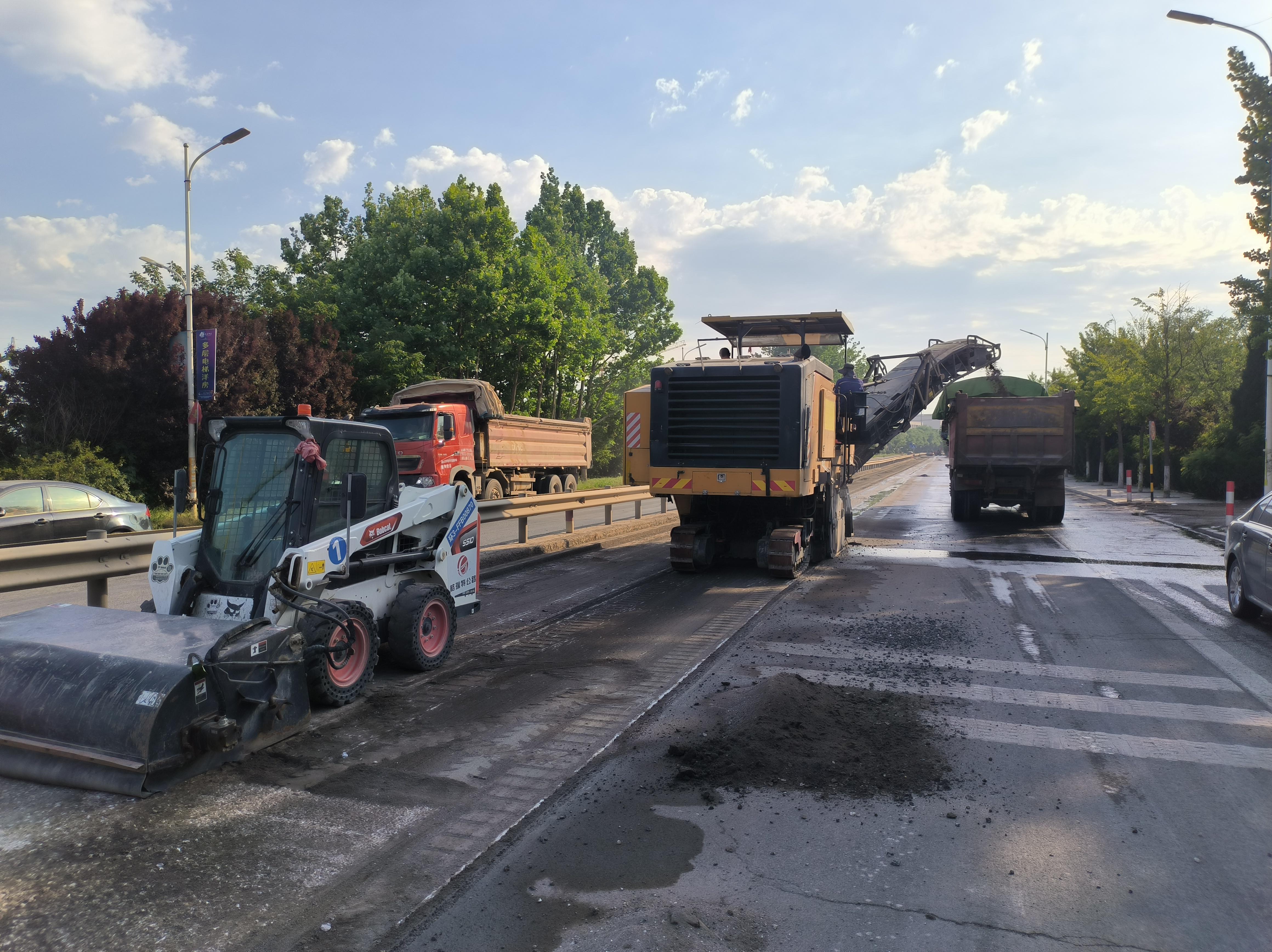 牟平公路中心相关负责人介绍,该路段多为山区公路、临水临崖及穿村路段较多,为避免影响端午节假期间市民出行,在保证安全、质量的前提下,协调路面与交安单位的交叉施工,保证工序有序衔接。节前,项目办邀请交警部门进行交工预验收,做到“封闭一段,完工一段,通车一段”,确保满足安全通车条件,在放假期间临时开放交通。 假日不松劲,迎战高温拉满进度条 9日上午,记者来到S308烟栖线福山段路面改造工程一合同段施工现场。数台大型设备开足马力、加紧施工,建设者们争分夺秒、铆足干劲。抓进度抢工期,公路人以高涨的工作热情,掀起了大干快干的热潮。 “项目是5月中旬开工的,今天一合同段正在进行路面铣刨,明天正式开始沥青摊铺环节。”福山公路中心养护科科长董学德告诉记者,“其实今天对于我们施工来说还不算热,等明天铺设沥青时,才是真的热”。据介绍,沥青出厂时的温度达到160—170℃,现场摊铺碾压时应不低于120℃。如果摊铺时温度偏低,碾压时压实度不足,工程质量就没有办法保证,所以高温天气是沥青摊铺的有利时机。目前,该路段已完成投资约600万元,占投资金额的12%,力争7月份完工通车。